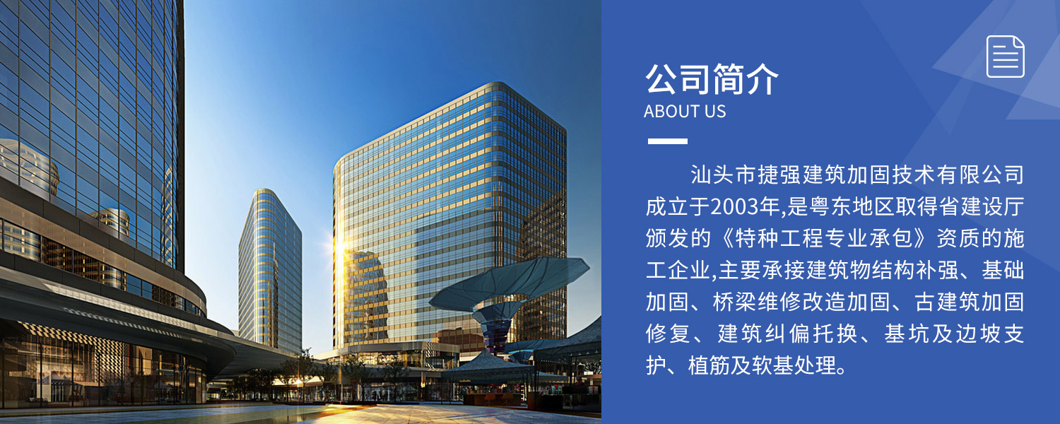 汕頭市捷強(qiáng)建筑加固技術(shù)有限公司 正式上線! 汕頭市捷強(qiáng)建筑加固技術(shù)有限公司是粵東地區(qū)取得省建設(shè)廳頒發(fā)的《特種工程專業(yè)承包》資質(zhì)的施工企業(yè)。 我們堅信,捷強(qiáng)能以其精湛的施工技術(shù),特優(yōu)的品質(zhì)價格贏得您的信賴與合作!